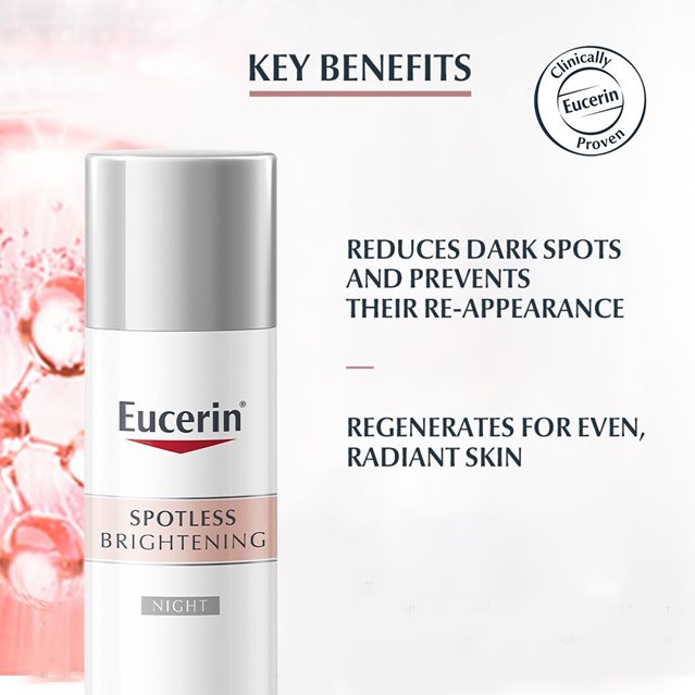 Eucerin Ultrawhite Spotless Night Fluid contains Thiamidol, an effective and patented ingredient that acts at the root cause of hyperpigmentation by reducing melanin production. It is clinically and dermatologically proven to reduce dark spots and prevent their re-appearance. First results are visible after two weeks and improve continuously with regular use.